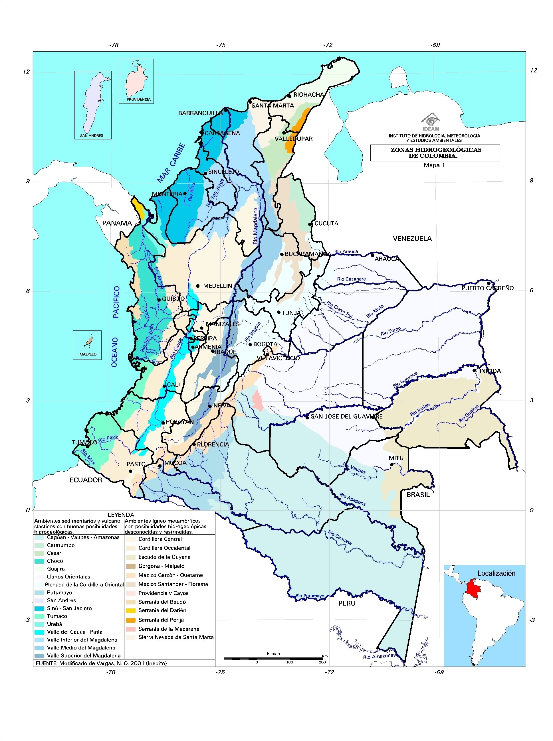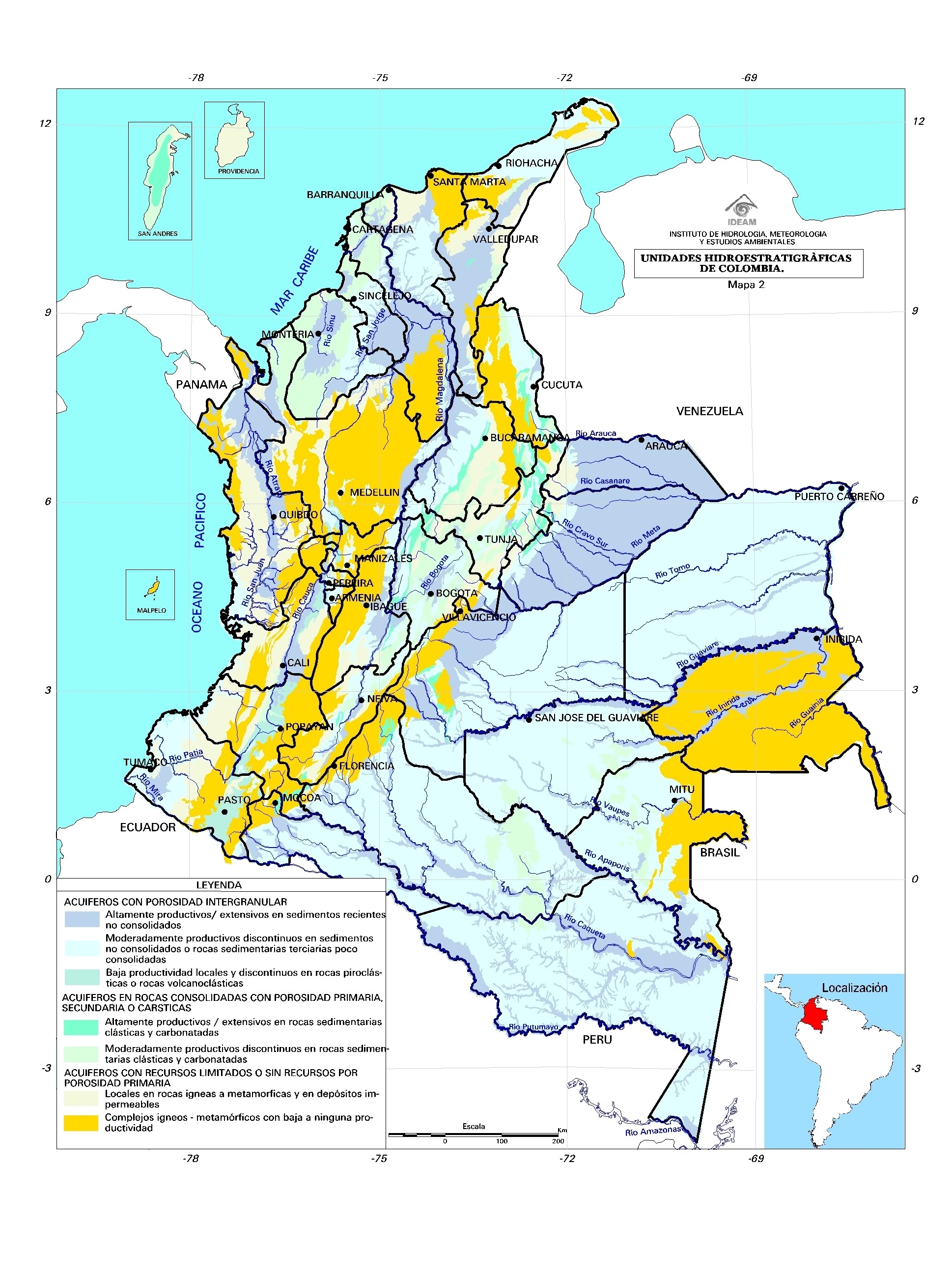 En este sentido, se utilizó como base el Mapa Geológico de Colombia (Geotec, 1987) publicado a escala 1:1.200.000. Su lectura se complementó con la revisión del Mapa Geológico de Colombia publicado por Ingeominas (1988). Se identifican cuencas y regiones Hidrogeológicas, que en conjunto son las Zonas Hidrogeológicas Homogéneas de Colombia, las cuales se representan en diferentes coberturas de un Sistema de Información Geográfica SIG, a la vez que se recopila y sistematiza la información asociada con estos productos de importancia nacional.