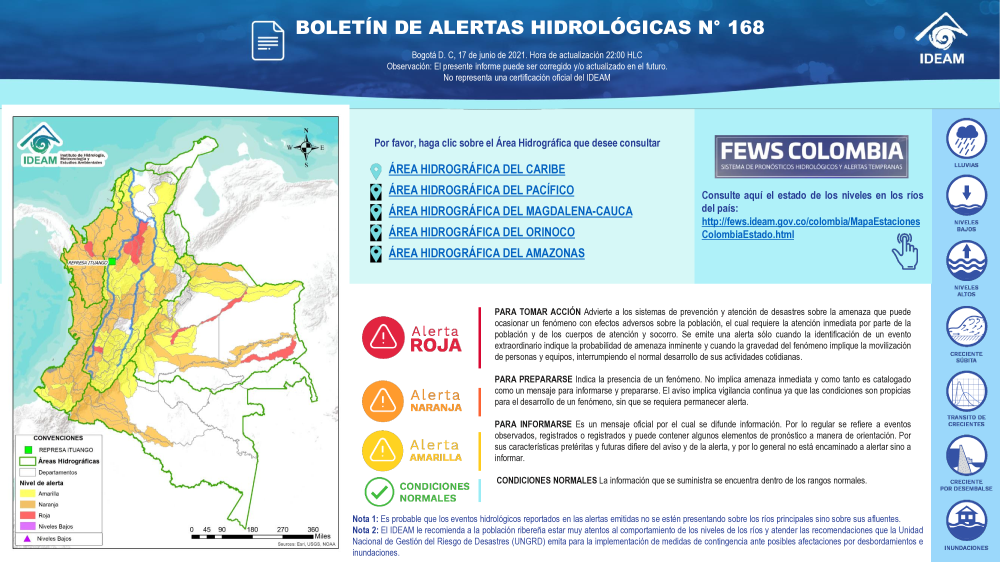 En general, el seguimiento que hace el Ideam del comportamiento hidrológico en los principales ríos del país se realiza con la información horaria en tiempo real que se recibe de las estaciones automáticas, complementadas con más de 40 estaciones hidrológicas que transmiten en las primeras horas cada mañana, los 365 días del año.
