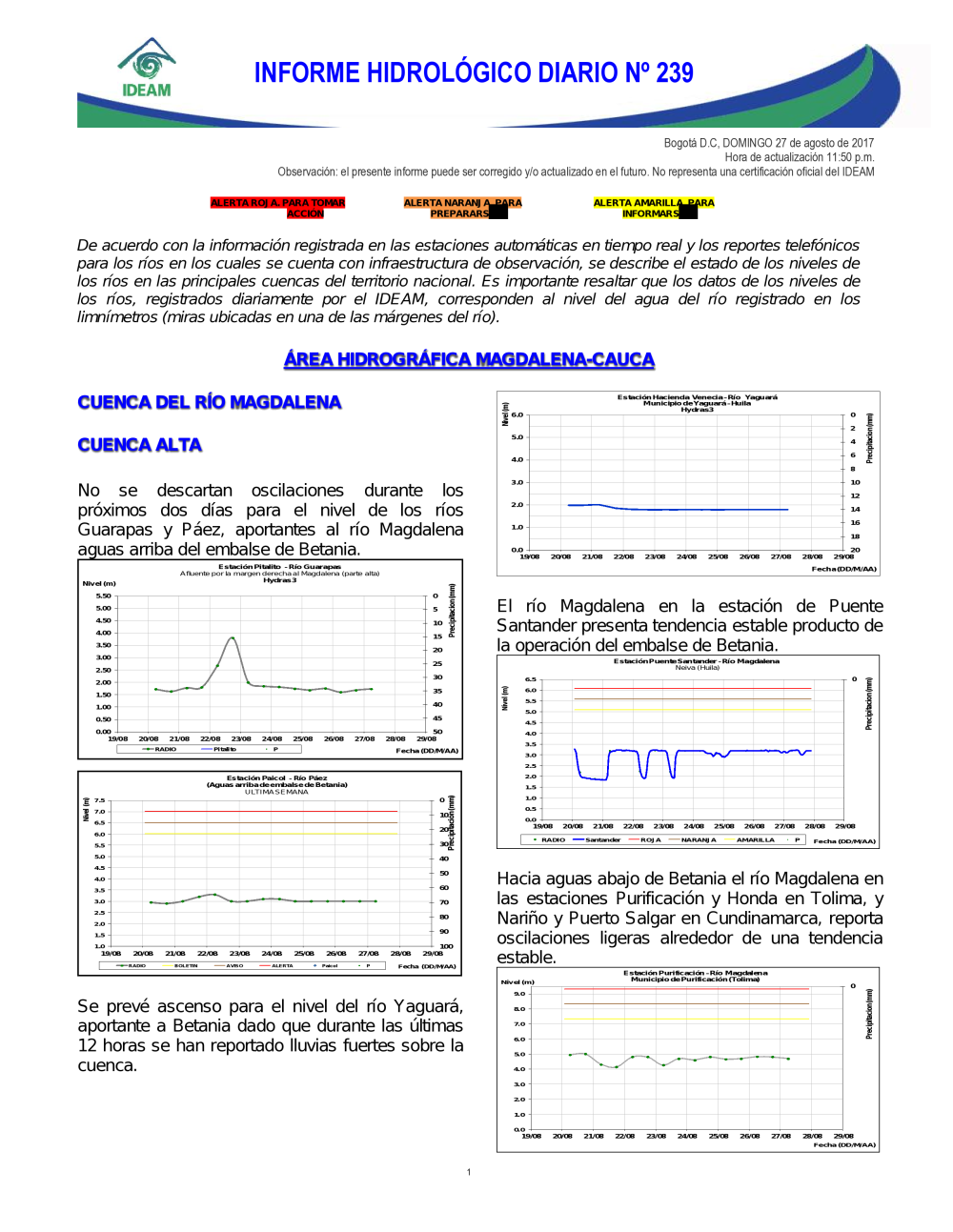 En general, el seguimiento que hace el Ideam del comportamiento hidrológico en los principales ríos del país se realiza con la información horaria en tiempo real que se recibe de las estaciones automáticas, complementadas con más de 40 estaciones hidrológicas que transmiten en las primeras horas cada mañana, los 365 días del año.