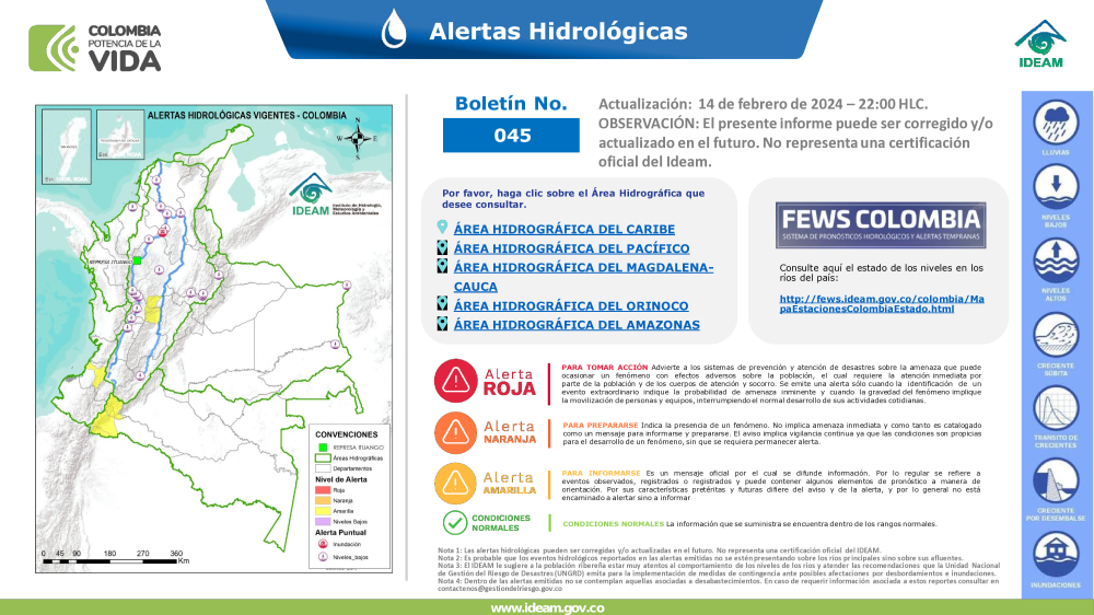 Además, en las cinco vertientes hidrográficas del territorio colombiano el Ideam tiene 834 estaciones hidrológicas (389 limnimétricas y 445 limnigráficas) para suministrar datos sobre el régimen hidrológico de los cauces y cuerpos de agua principales, para hacer seguimiento al proceso de la escorrentía en el ciclo hidrológico y a los eventos extremos asociados. Algunos parámetros se observan dos veces al día, como el nivel del río y la concentración de sedimentos.