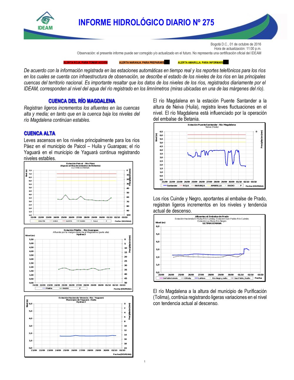 En general, el seguimiento que hace el Ideam del comportamiento hidrológico en los principales ríos del país se realiza con la información horaria en tiempo real que se recibe de las estaciones automáticas, complementadas con más de 40 estaciones hidrológicas que transmiten en las primeras horas cada mañana, los 365 días del año.
