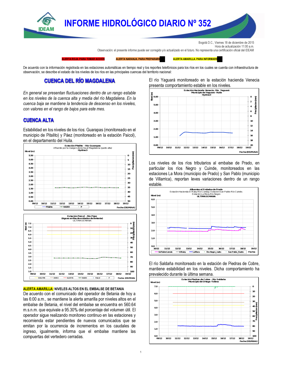 En general, el seguimiento que hace el Ideam del comportamiento hidrológico en los principales ríos del país se realiza con la información horaria en tiempo real que se recibe de las estaciones automáticas, complementadas con más de 40 estaciones hidrológicas que transmiten en las primeras horas cada mañana, los 365 días del año.