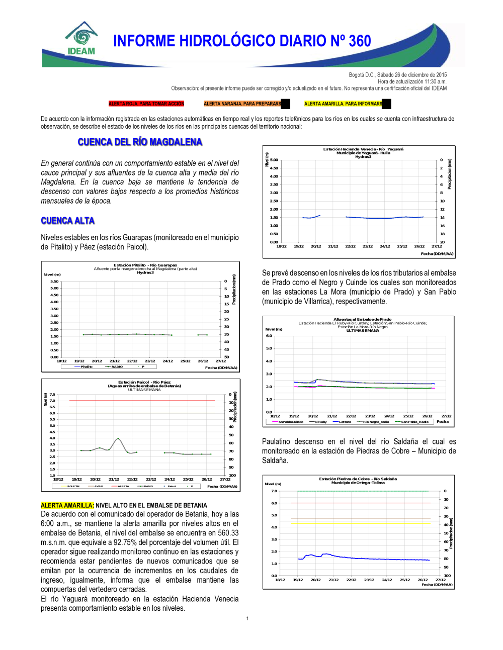 En general, el seguimiento que hace el Ideam del comportamiento hidrológico en los principales ríos del país se realiza con la información horaria en tiempo real que se recibe de las estaciones automáticas, complementadas con más de 40 estaciones hidrológicas que transmiten en las primeras horas cada mañana, los 365 días del año.