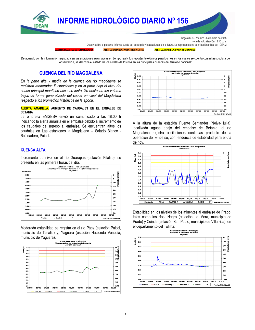En general, el seguimiento que hace el Ideam del comportamiento hidrológico en los principales ríos del país se realiza con la información horaria en tiempo real que se recibe de las estaciones automáticas, complementadas con más de 40 estaciones hidrológicas que transmiten en las primeras horas cada mañana, los 365 días del año.