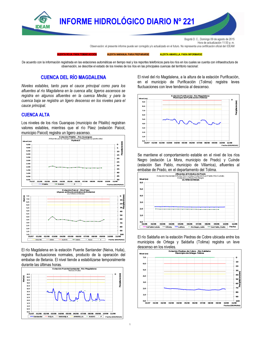 En general, el seguimiento que hace el Ideam del comportamiento hidrológico en los principales ríos del país se realiza con la información horaria en tiempo real que se recibe de las estaciones automáticas, complementadas con más de 40 estaciones hidrológicas que transmiten en las primeras horas cada mañana, los 365 días del año.
