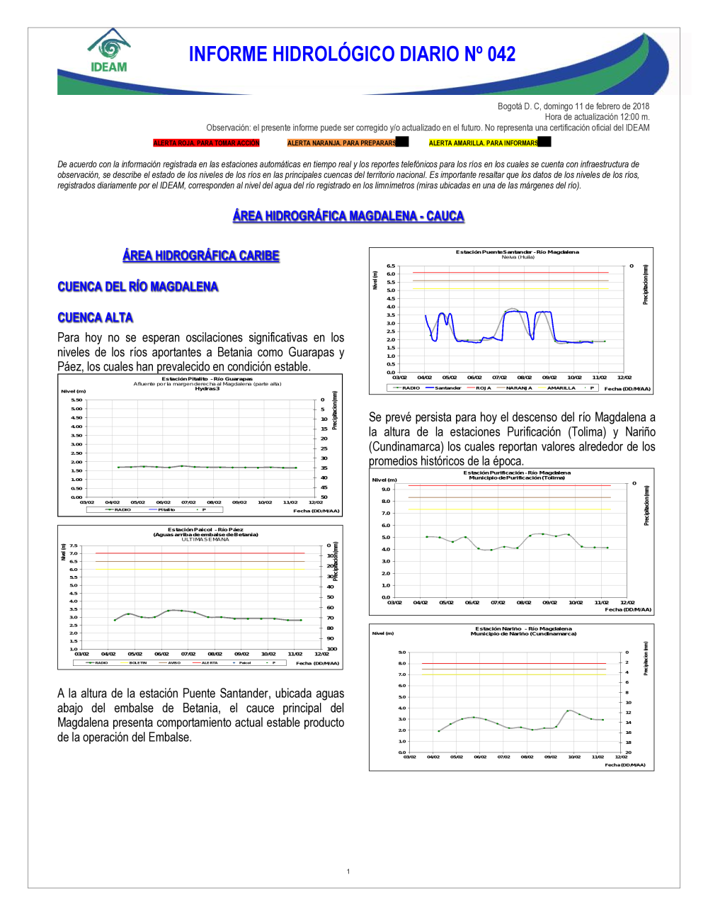 En general, el seguimiento que hace el Ideam del comportamiento hidrológico en los principales ríos del país se realiza con la información horaria en tiempo real que se recibe de las estaciones automáticas, complementadas con más de 40 estaciones hidrológicas que transmiten en las primeras horas cada mañana, los 365 días del año.