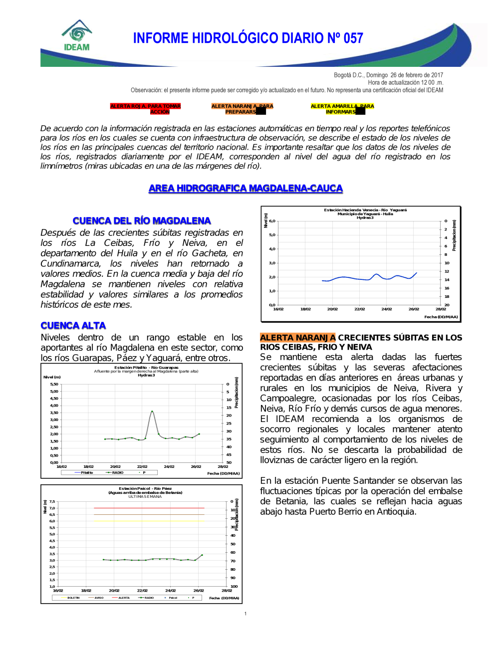 En general, el seguimiento que hace el Ideam del comportamiento hidrológico en los principales ríos del país se realiza con la información horaria en tiempo real que se recibe de las estaciones automáticas, complementadas con más de 40 estaciones hidrológicas que transmiten en las primeras horas cada mañana, los 365 días del año.