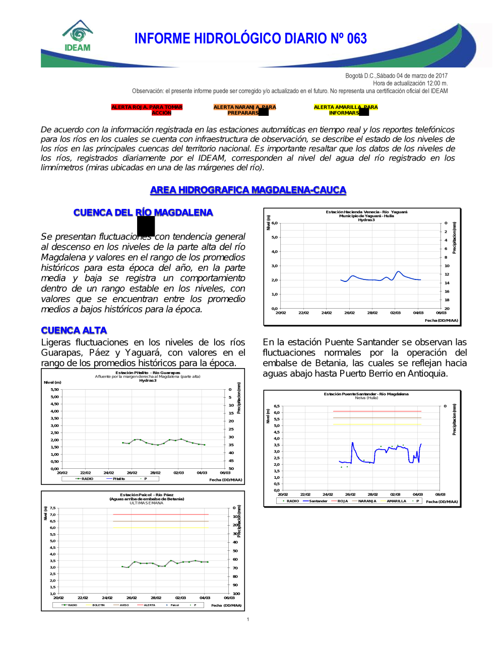 En general, el seguimiento que hace el Ideam del comportamiento hidrológico en los principales ríos del país se realiza con la información horaria en tiempo real que se recibe de las estaciones automáticas, complementadas con más de 40 estaciones hidrológicas que transmiten en las primeras horas cada mañana, los 365 días del año.