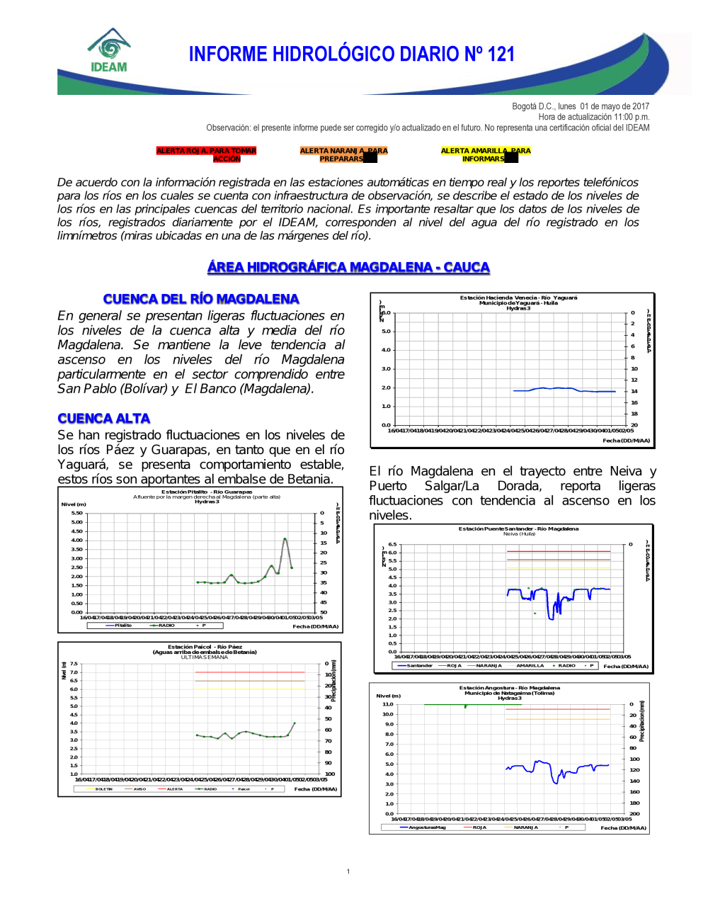En general, el seguimiento que hace el Ideam del comportamiento hidrológico en los principales ríos del país se realiza con la información horaria en tiempo real que se recibe de las estaciones automáticas, complementadas con más de 40 estaciones hidrológicas que transmiten en las primeras horas cada mañana, los 365 días del año.