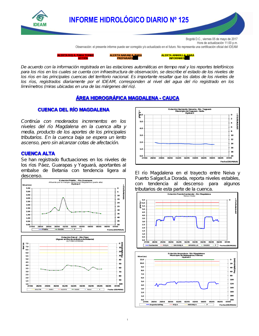 En general, el seguimiento que hace el Ideam del comportamiento hidrológico en los principales ríos del país se realiza con la información horaria en tiempo real que se recibe de las estaciones automáticas, complementadas con más de 40 estaciones hidrológicas que transmiten en las primeras horas cada mañana, los 365 días del año.