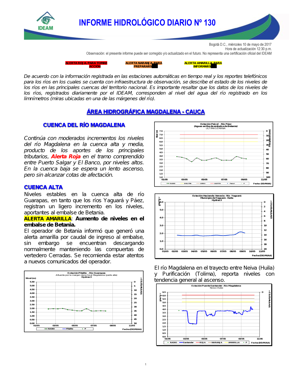 En general, el seguimiento que hace el Ideam del comportamiento hidrológico en los principales ríos del país se realiza con la información horaria en tiempo real que se recibe de las estaciones automáticas, complementadas con más de 40 estaciones hidrológicas que transmiten en las primeras horas cada mañana, los 365 días del año.