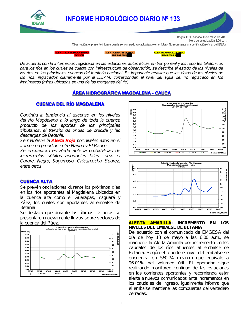 En general, el seguimiento que hace el Ideam del comportamiento hidrológico en los principales ríos del país se realiza con la información horaria en tiempo real que se recibe de las estaciones automáticas, complementadas con más de 40 estaciones hidrológicas que transmiten en las primeras horas cada mañana, los 365 días del año.