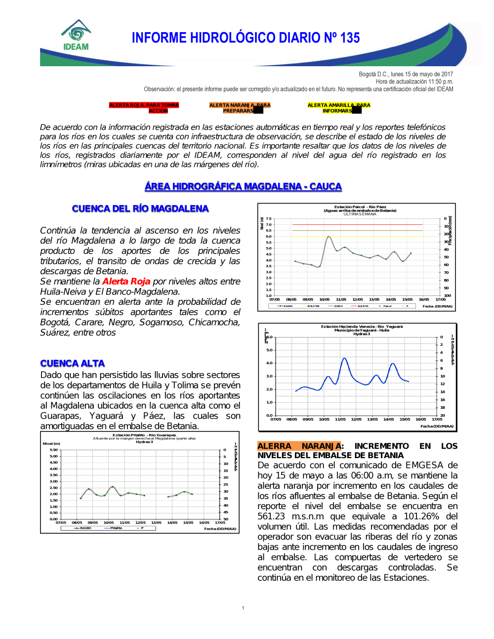 En general, el seguimiento que hace el Ideam del comportamiento hidrológico en los principales ríos del país se realiza con la información horaria en tiempo real que se recibe de las estaciones automáticas, complementadas con más de 40 estaciones hidrológicas que transmiten en las primeras horas cada mañana, los 365 días del año.