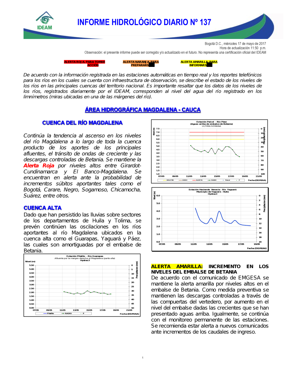 En general, el seguimiento que hace el Ideam del comportamiento hidrológico en los principales ríos del país se realiza con la información horaria en tiempo real que se recibe de las estaciones automáticas, complementadas con más de 40 estaciones hidrológicas que transmiten en las primeras horas cada mañana, los 365 días del año.