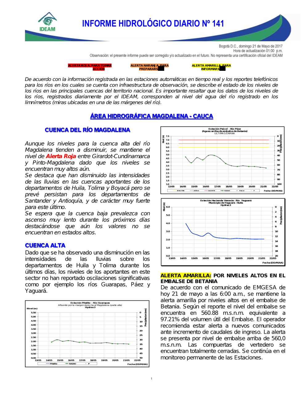 En general, el seguimiento que hace el Ideam del comportamiento hidrológico en los principales ríos del país se realiza con la información horaria en tiempo real que se recibe de las estaciones automáticas, complementadas con más de 40 estaciones hidrológicas que transmiten en las primeras horas cada mañana, los 365 días del año.