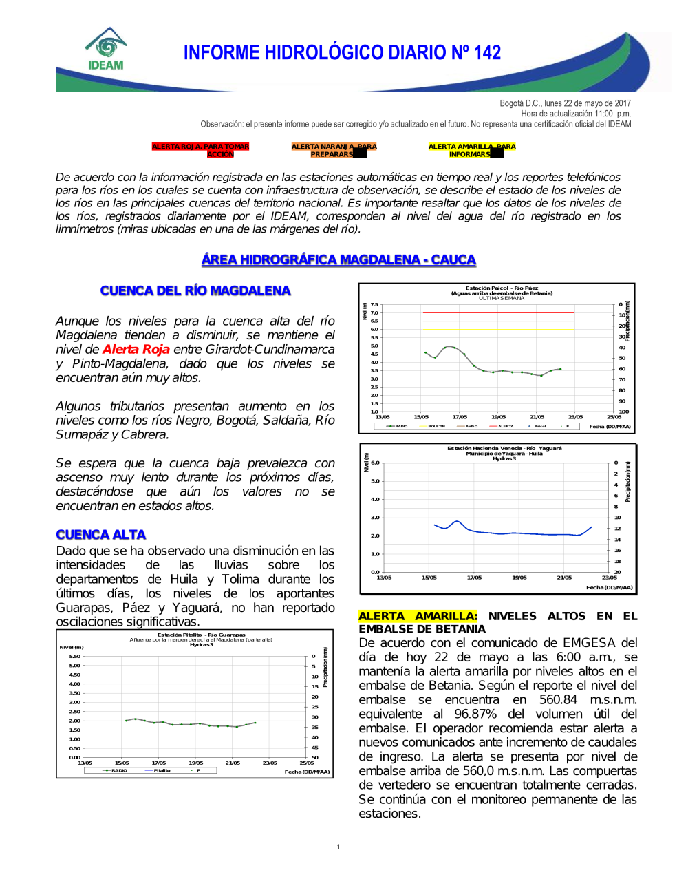 En general, el seguimiento que hace el Ideam del comportamiento hidrológico en los principales ríos del país se realiza con la información horaria en tiempo real que se recibe de las estaciones automáticas, complementadas con más de 40 estaciones hidrológicas que transmiten en las primeras horas cada mañana, los 365 días del año.