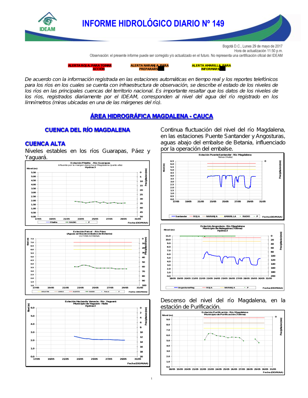 En general, el seguimiento que hace el Ideam del comportamiento hidrológico en los principales ríos del país se realiza con la información horaria en tiempo real que se recibe de las estaciones automáticas, complementadas con más de 40 estaciones hidrológicas que transmiten en las primeras horas cada mañana, los 365 días del año.