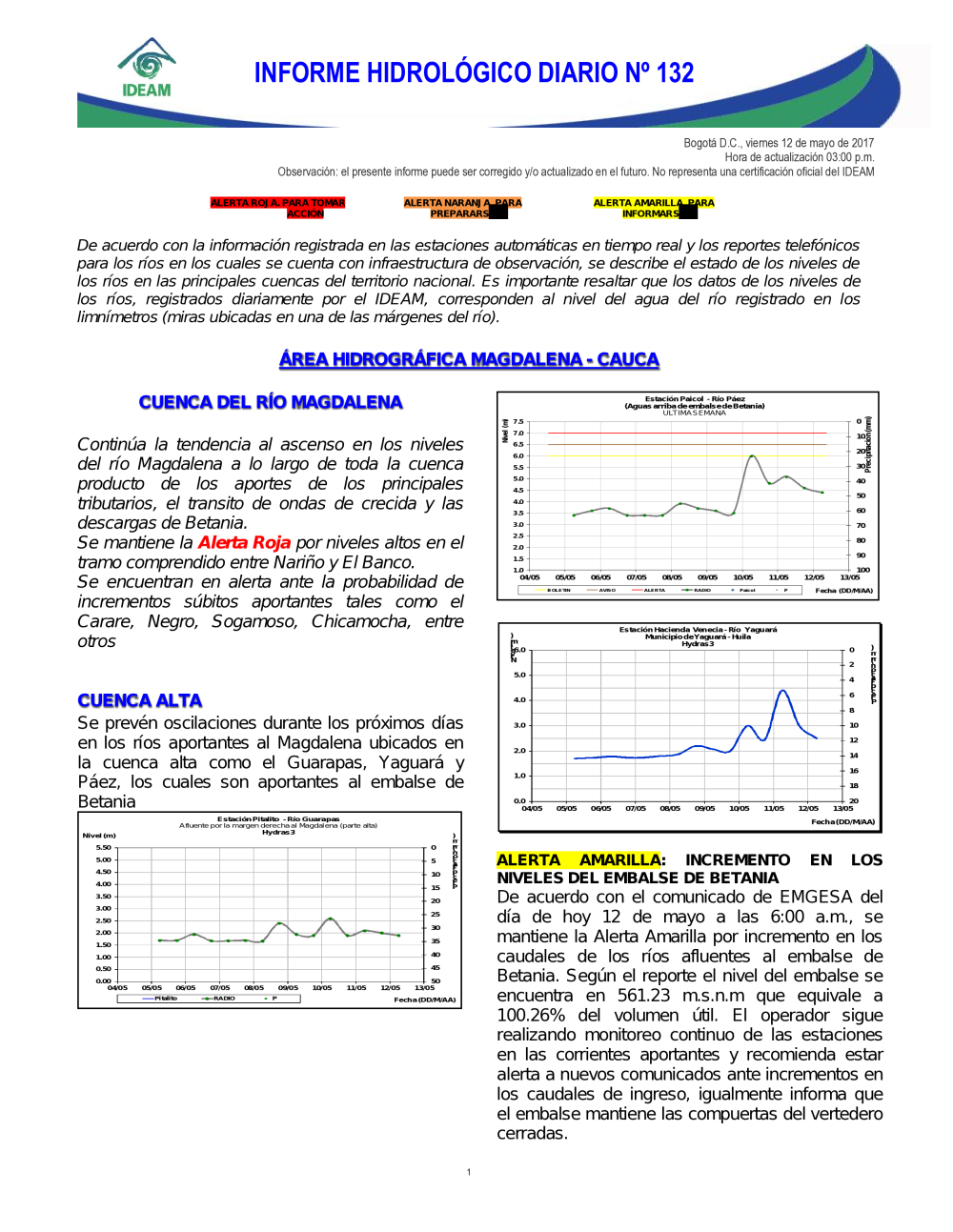 En general, el seguimiento que hace el Ideam del comportamiento hidrológico en los principales ríos del país se realiza con la información horaria en tiempo real que se recibe de las estaciones automáticas, complementadas con más de 40 estaciones hidrológicas que transmiten en las primeras horas cada mañana, los 365 días del año.