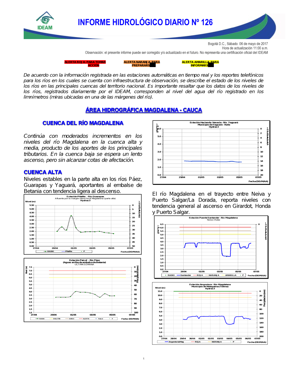 En general, el seguimiento que hace el Ideam del comportamiento hidrológico en los principales ríos del país se realiza con la información horaria en tiempo real que se recibe de las estaciones automáticas, complementadas con más de 40 estaciones hidrológicas que transmiten en las primeras horas cada mañana, los 365 días del año.