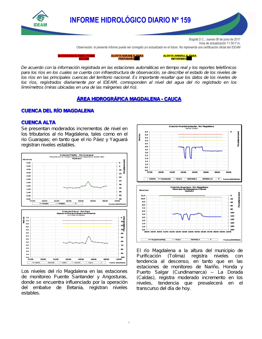 En general, el seguimiento que hace el Ideam del comportamiento hidrológico en los principales ríos del país se realiza con la información horaria en tiempo real que se recibe de las estaciones automáticas, complementadas con más de 40 estaciones hidrológicas que transmiten en las primeras horas cada mañana, los 365 días del año.