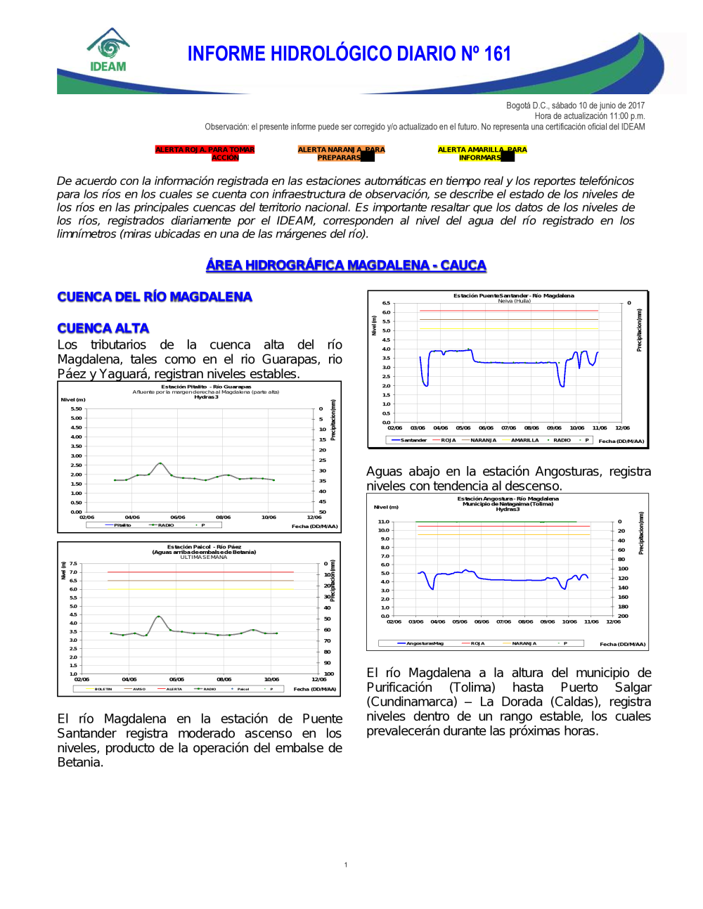 En general, el seguimiento que hace el Ideam del comportamiento hidrológico en los principales ríos del país se realiza con la información horaria en tiempo real que se recibe de las estaciones automáticas, complementadas con más de 40 estaciones hidrológicas que transmiten en las primeras horas cada mañana, los 365 días del año.