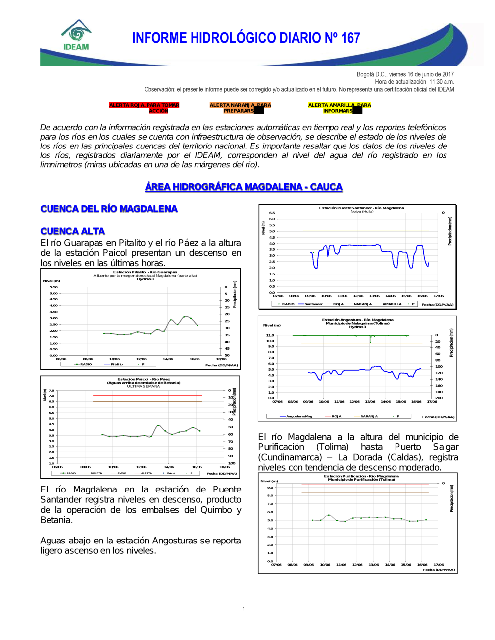 En general, el seguimiento que hace el Ideam del comportamiento hidrológico en los principales ríos del país se realiza con la información horaria en tiempo real que se recibe de las estaciones automáticas, complementadas con más de 40 estaciones hidrológicas que transmiten en las primeras horas cada mañana, los 365 días del año.