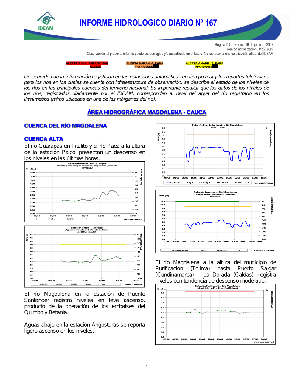 En general, el seguimiento que hace el Ideam del comportamiento hidrológico en los principales ríos del país se realiza con la información horaria en tiempo real que se recibe de las estaciones automáticas, complementadas con más de 40 estaciones hidrológicas que transmiten en las primeras horas cada mañana, los 365 días del año.