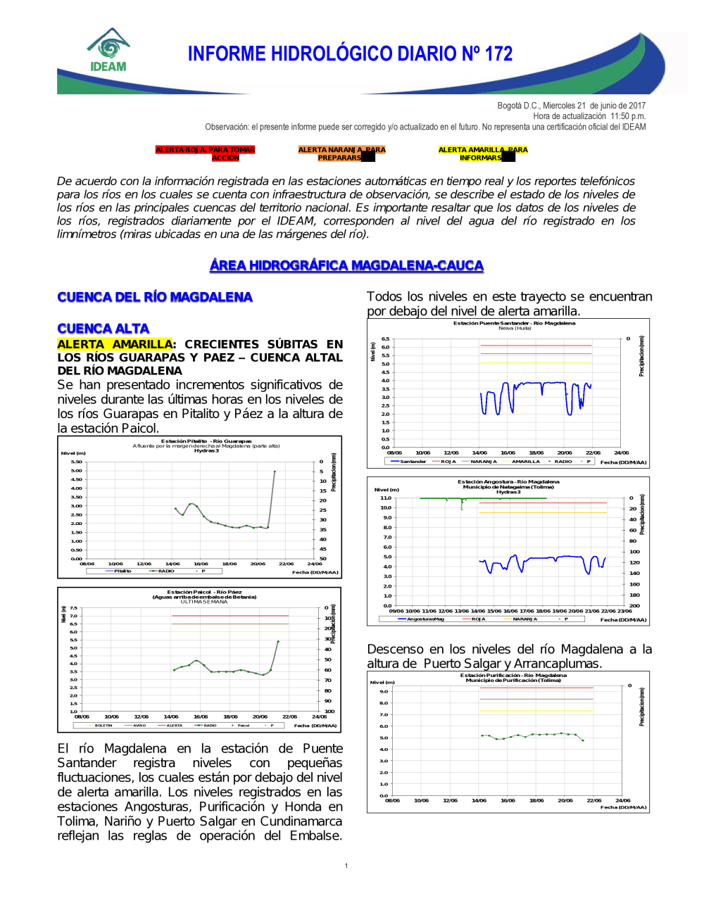 En general, el seguimiento que hace el Ideam del comportamiento hidrológico en los principales ríos del país se realiza con la información horaria en tiempo real que se recibe de las estaciones automáticas, complementadas con más de 40 estaciones hidrológicas que transmiten en las primeras horas cada mañana, los 365 días del año.