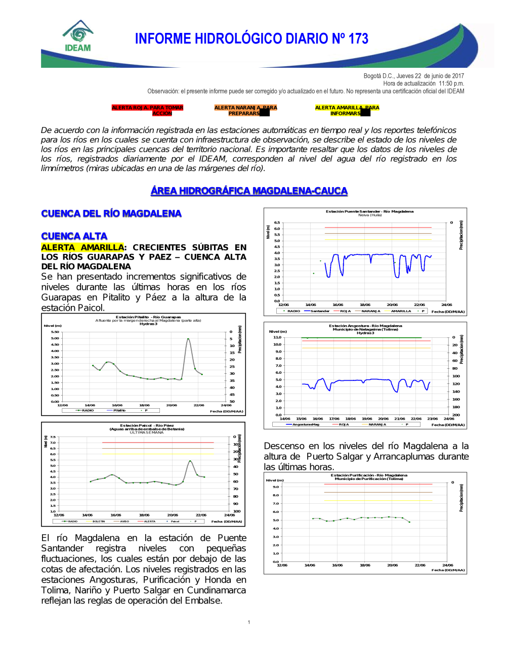 En general, el seguimiento que hace el Ideam del comportamiento hidrológico en los principales ríos del país se realiza con la información horaria en tiempo real que se recibe de las estaciones automáticas, complementadas con más de 40 estaciones hidrológicas que transmiten en las primeras horas cada mañana, los 365 días del año.