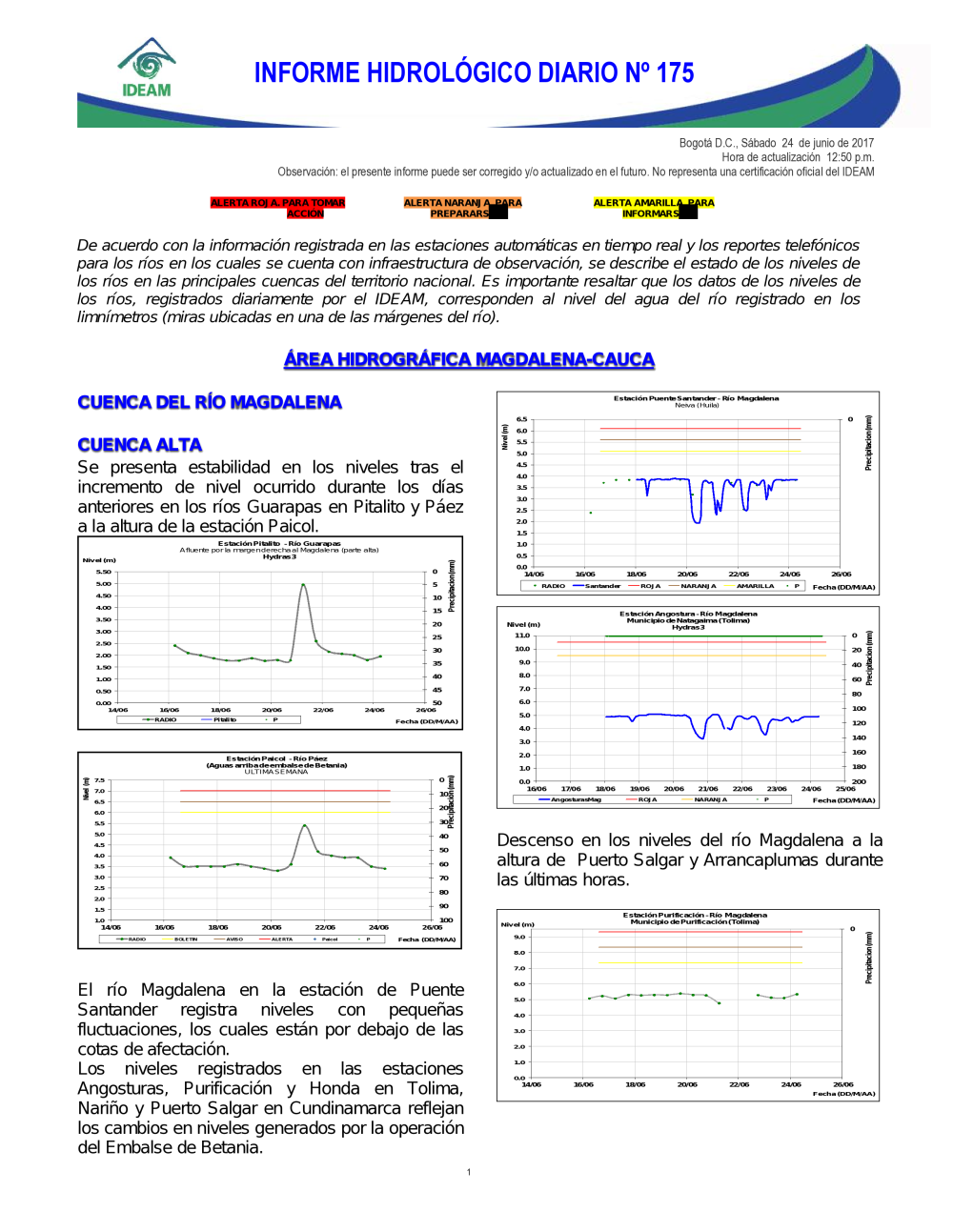 En general, el seguimiento que hace el Ideam del comportamiento hidrológico en los principales ríos del país se realiza con la información horaria en tiempo real que se recibe de las estaciones automáticas, complementadas con más de 40 estaciones hidrológicas que transmiten en las primeras horas cada mañana, los 365 días del año.