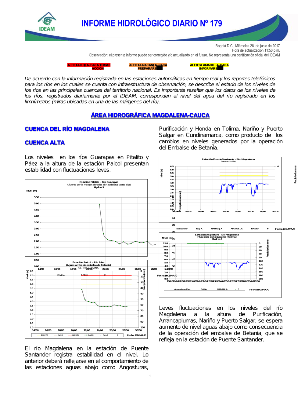 En general, el seguimiento que hace el Ideam del comportamiento hidrológico en los principales ríos del país se realiza con la información horaria en tiempo real que se recibe de las estaciones automáticas, complementadas con más de 40 estaciones hidrológicas que transmiten en las primeras horas cada mañana, los 365 días del año.