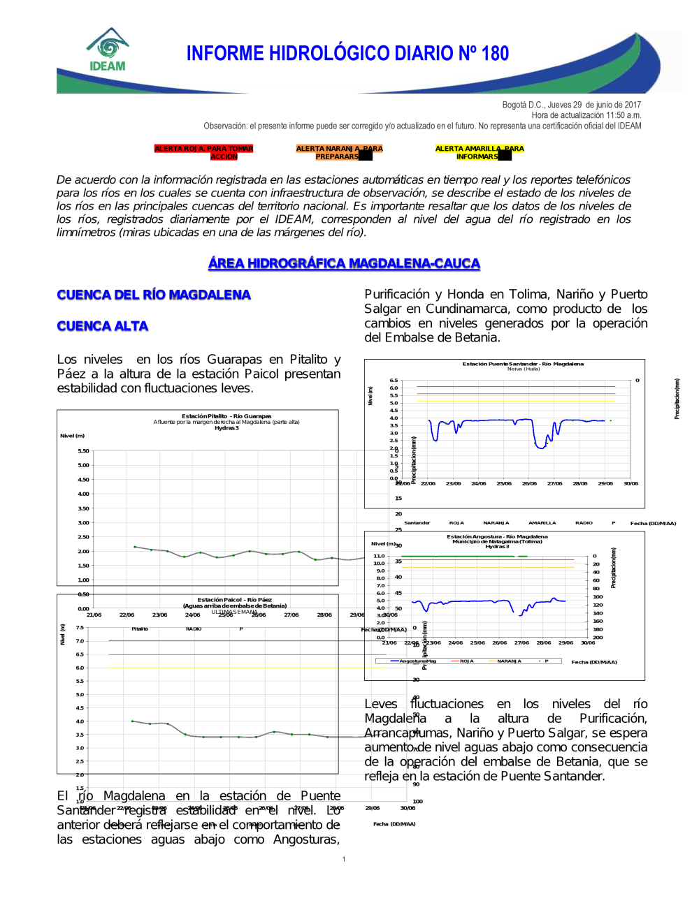 En general, el seguimiento que hace el Ideam del comportamiento hidrológico en los principales ríos del país se realiza con la información horaria en tiempo real que se recibe de las estaciones automáticas, complementadas con más de 40 estaciones hidrológicas que transmiten en las primeras horas cada mañana, los 365 días del año.