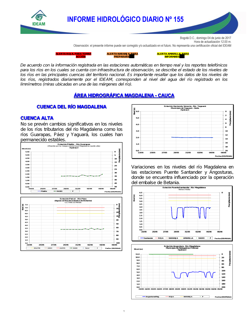 En general, el seguimiento que hace el Ideam del comportamiento hidrológico en los principales ríos del país se realiza con la información horaria en tiempo real que se recibe de las estaciones automáticas, complementadas con más de 40 estaciones hidrológicas que transmiten en las primeras horas cada mañana, los 365 días del año.