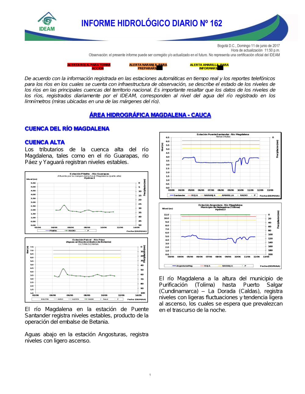 En general, el seguimiento que hace el Ideam del comportamiento hidrológico en los principales ríos del país se realiza con la información horaria en tiempo real que se recibe de las estaciones automáticas, complementadas con más de 40 estaciones hidrológicas que transmiten en las primeras horas cada mañana, los 365 días del año.