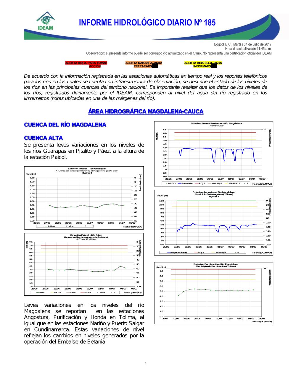 En general, el seguimiento que hace el Ideam del comportamiento hidrológico en los principales ríos del país se realiza con la información horaria en tiempo real que se recibe de las estaciones automáticas, complementadas con más de 40 estaciones hidrológicas que transmiten en las primeras horas cada mañana, los 365 días del año.