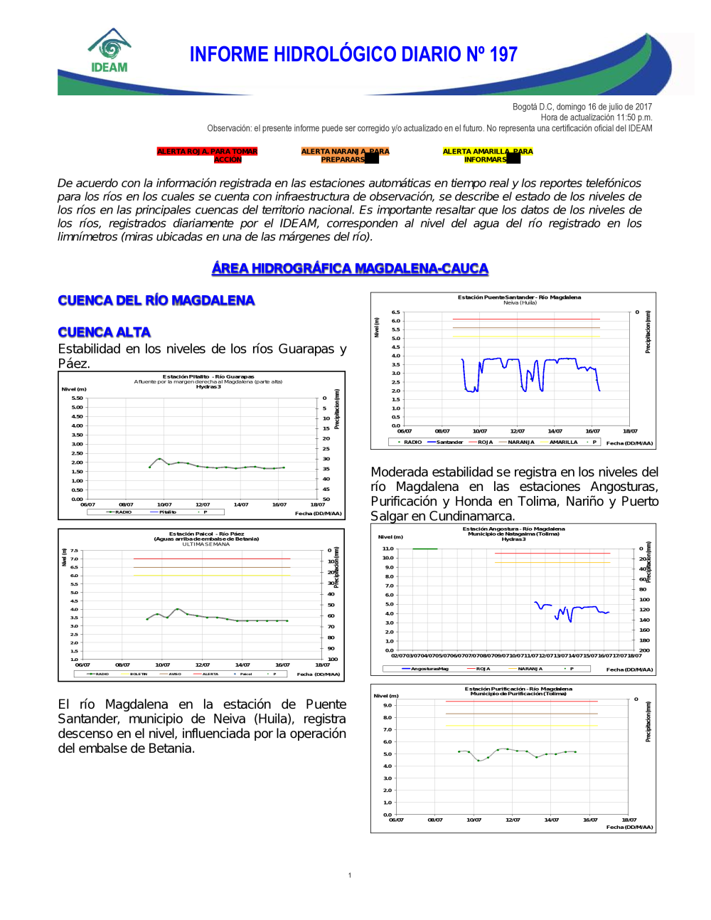 En general, el seguimiento que hace el Ideam del comportamiento hidrológico en los principales ríos del país se realiza con la información horaria en tiempo real que se recibe de las estaciones automáticas, complementadas con más de 40 estaciones hidrológicas que transmiten en las primeras horas cada mañana, los 365 días del año.