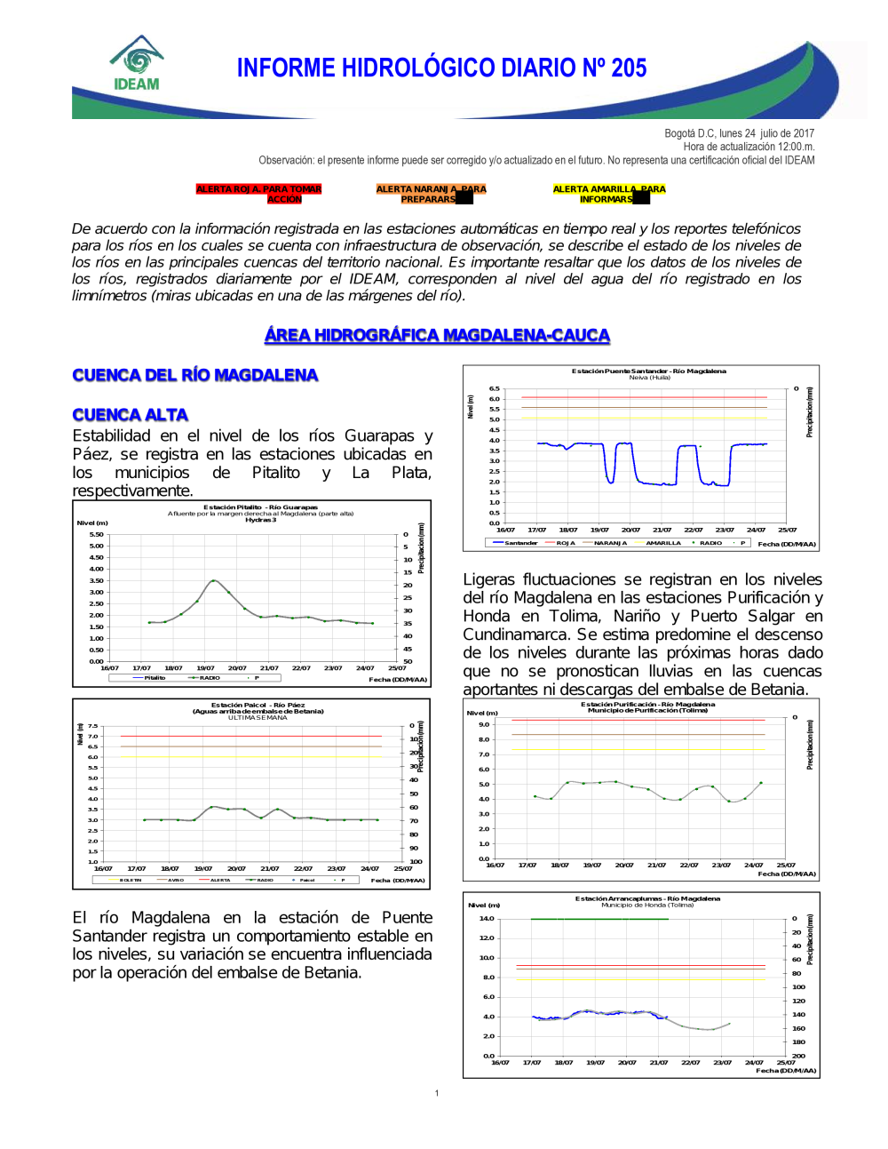 En general, el seguimiento que hace el Ideam del comportamiento hidrológico en los principales ríos del país se realiza con la información horaria en tiempo real que se recibe de las estaciones automáticas, complementadas con más de 40 estaciones hidrológicas que transmiten en las primeras horas cada mañana, los 365 días del año.