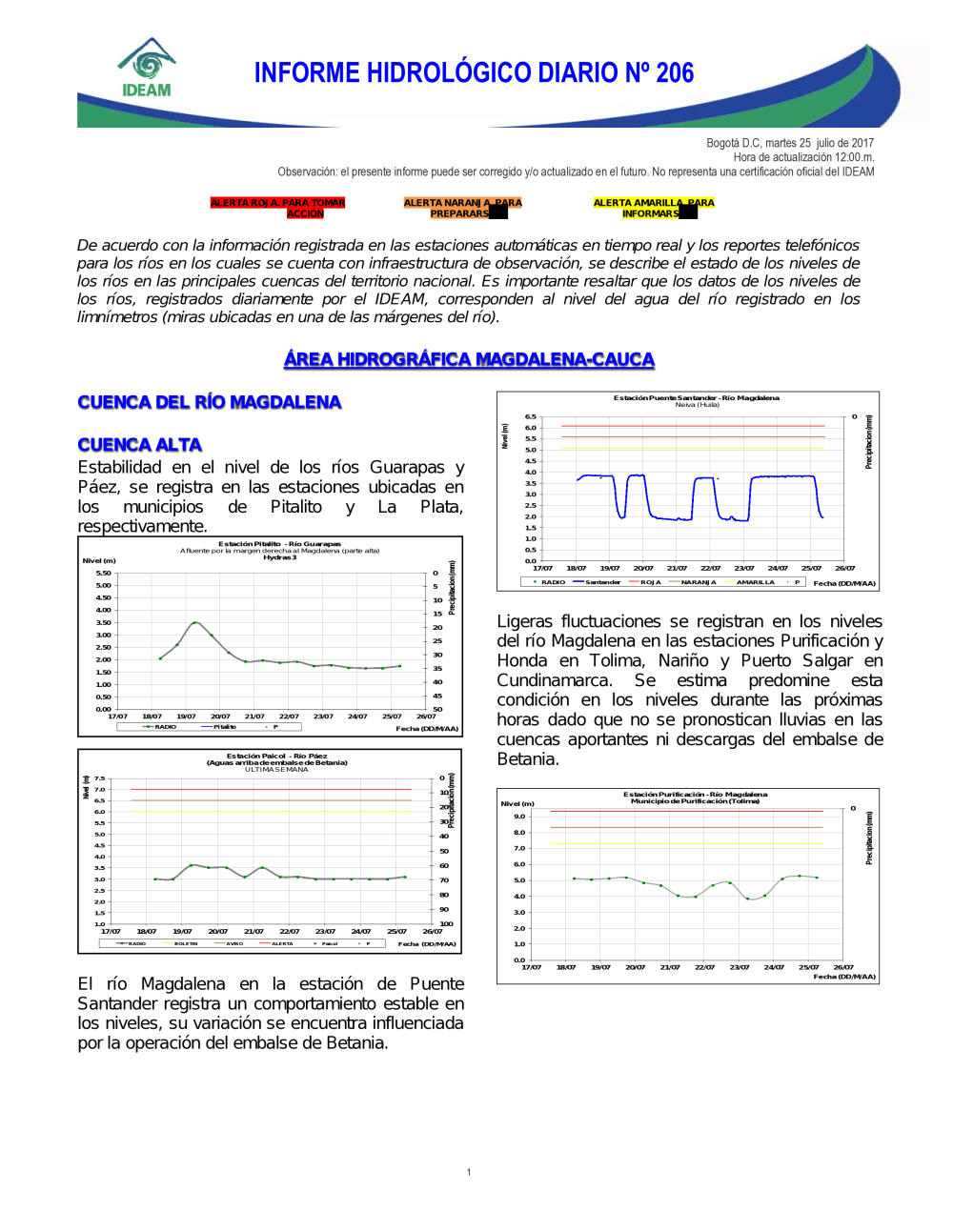 En general, el seguimiento que hace el Ideam del comportamiento hidrológico en los principales ríos del país se realiza con la información horaria en tiempo real que se recibe de las estaciones automáticas, complementadas con más de 40 estaciones hidrológicas que transmiten en las primeras horas cada mañana, los 365 días del año.