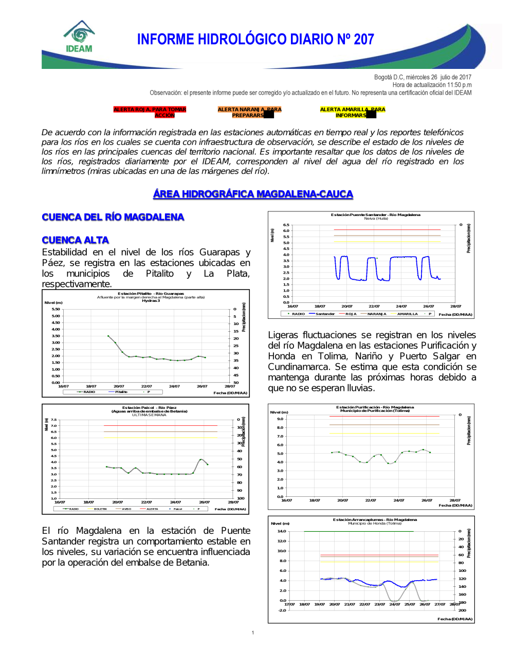 En general, el seguimiento que hace el Ideam del comportamiento hidrológico en los principales ríos del país se realiza con la información horaria en tiempo real que se recibe de las estaciones automáticas, complementadas con más de 40 estaciones hidrológicas que transmiten en las primeras horas cada mañana, los 365 días del año.