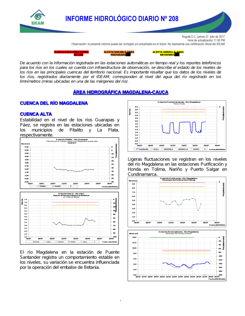 En general, el seguimiento que hace el Ideam del comportamiento hidrológico en los principales ríos del país se realiza con la información horaria en tiempo real que se recibe de las estaciones automáticas, complementadas con más de 40 estaciones hidrológicas que transmiten en las primeras horas cada mañana, los 365 días del año.