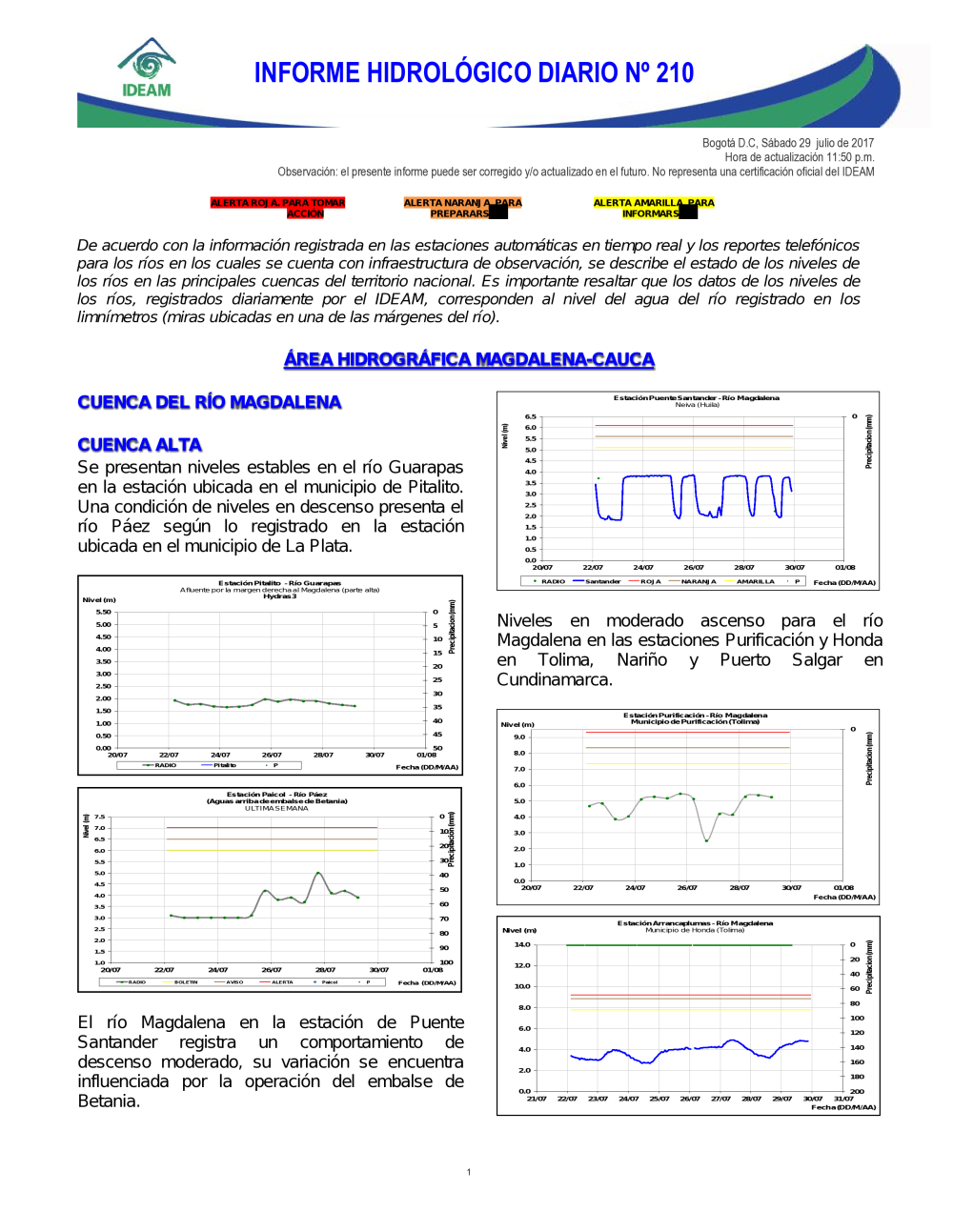 En general, el seguimiento que hace el Ideam del comportamiento hidrológico en los principales ríos del país se realiza con la información horaria en tiempo real que se recibe de las estaciones automáticas, complementadas con más de 40 estaciones hidrológicas que transmiten en las primeras horas cada mañana, los 365 días del año.