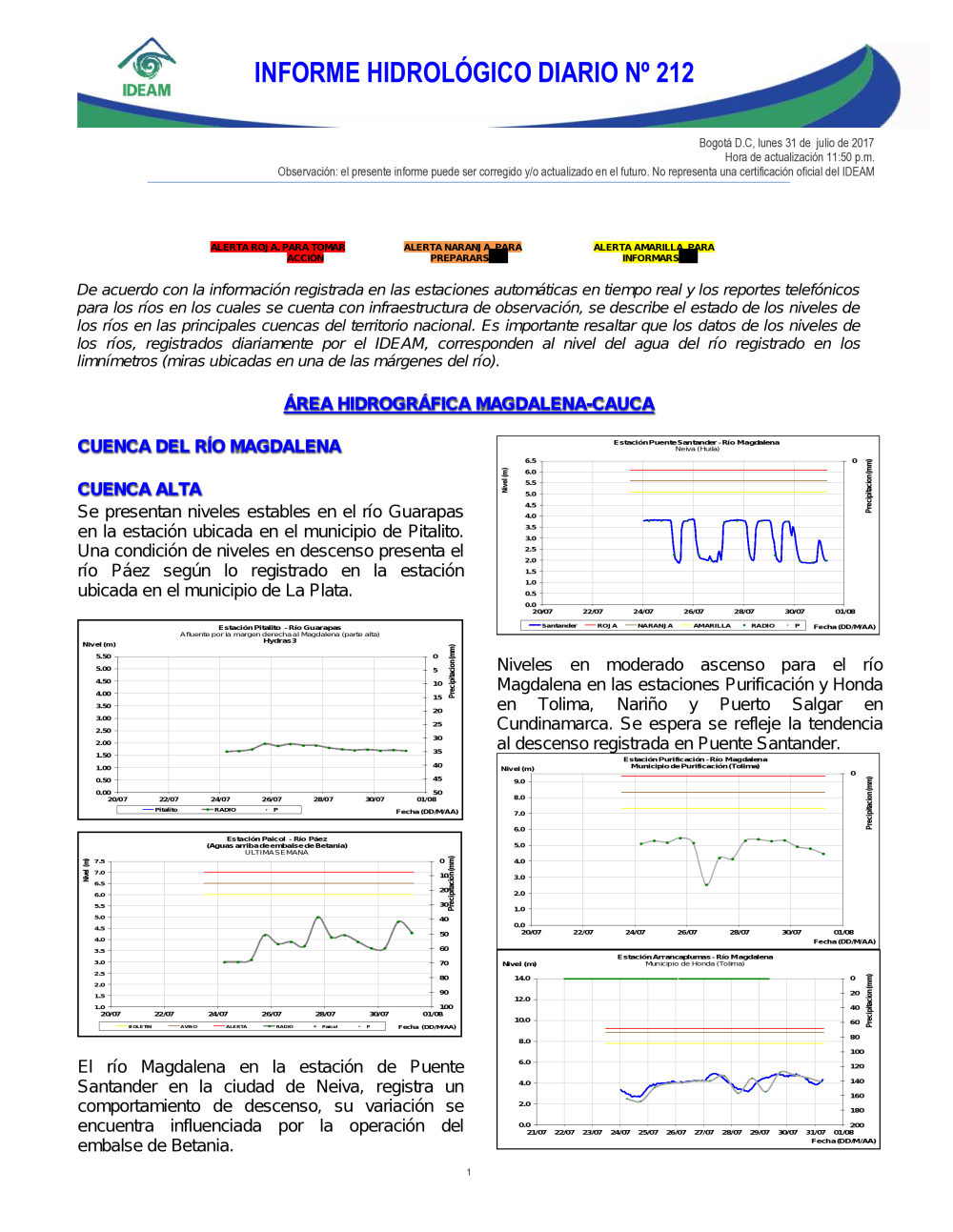 En general, el seguimiento que hace el Ideam del comportamiento hidrológico en los principales ríos del país se realiza con la información horaria en tiempo real que se recibe de las estaciones automáticas, complementadas con más de 40 estaciones hidrológicas que transmiten en las primeras horas cada mañana, los 365 días del año.