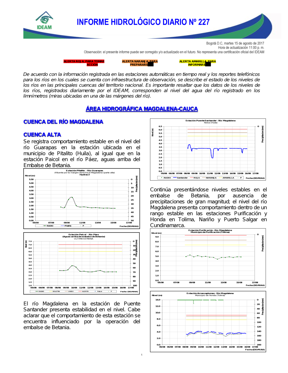 En general, el seguimiento que hace el Ideam del comportamiento hidrológico en los principales ríos del país se realiza con la información horaria en tiempo real que se recibe de las estaciones automáticas, complementadas con más de 40 estaciones hidrológicas que transmiten en las primeras horas cada mañana, los 365 días del año.