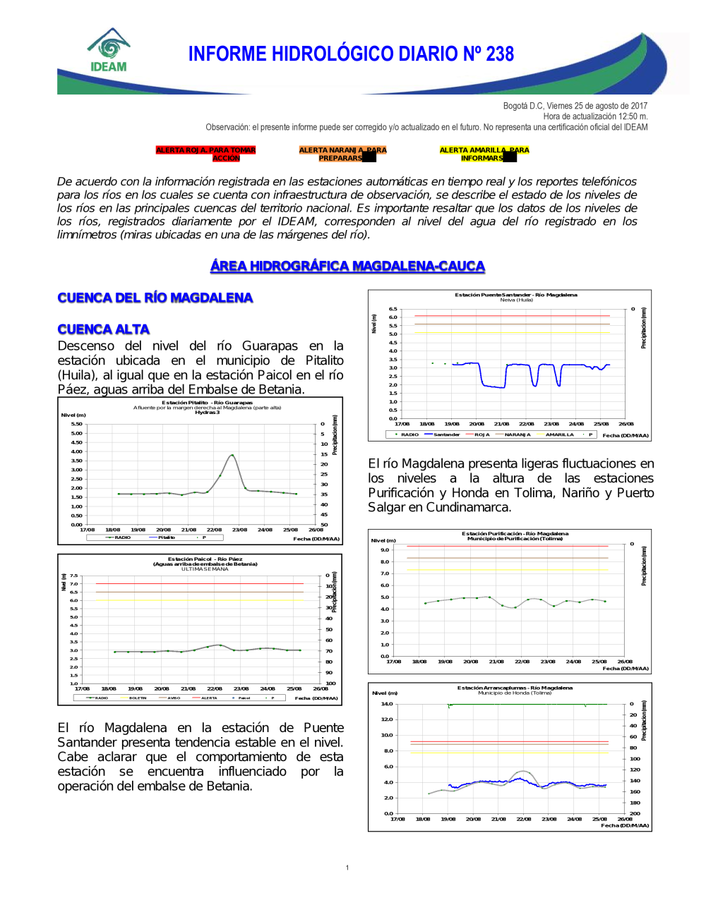 En general, el seguimiento que hace el Ideam del comportamiento hidrológico en los principales ríos del país se realiza con la información horaria en tiempo real que se recibe de las estaciones automáticas, complementadas con más de 40 estaciones hidrológicas que transmiten en las primeras horas cada mañana, los 365 días del año.