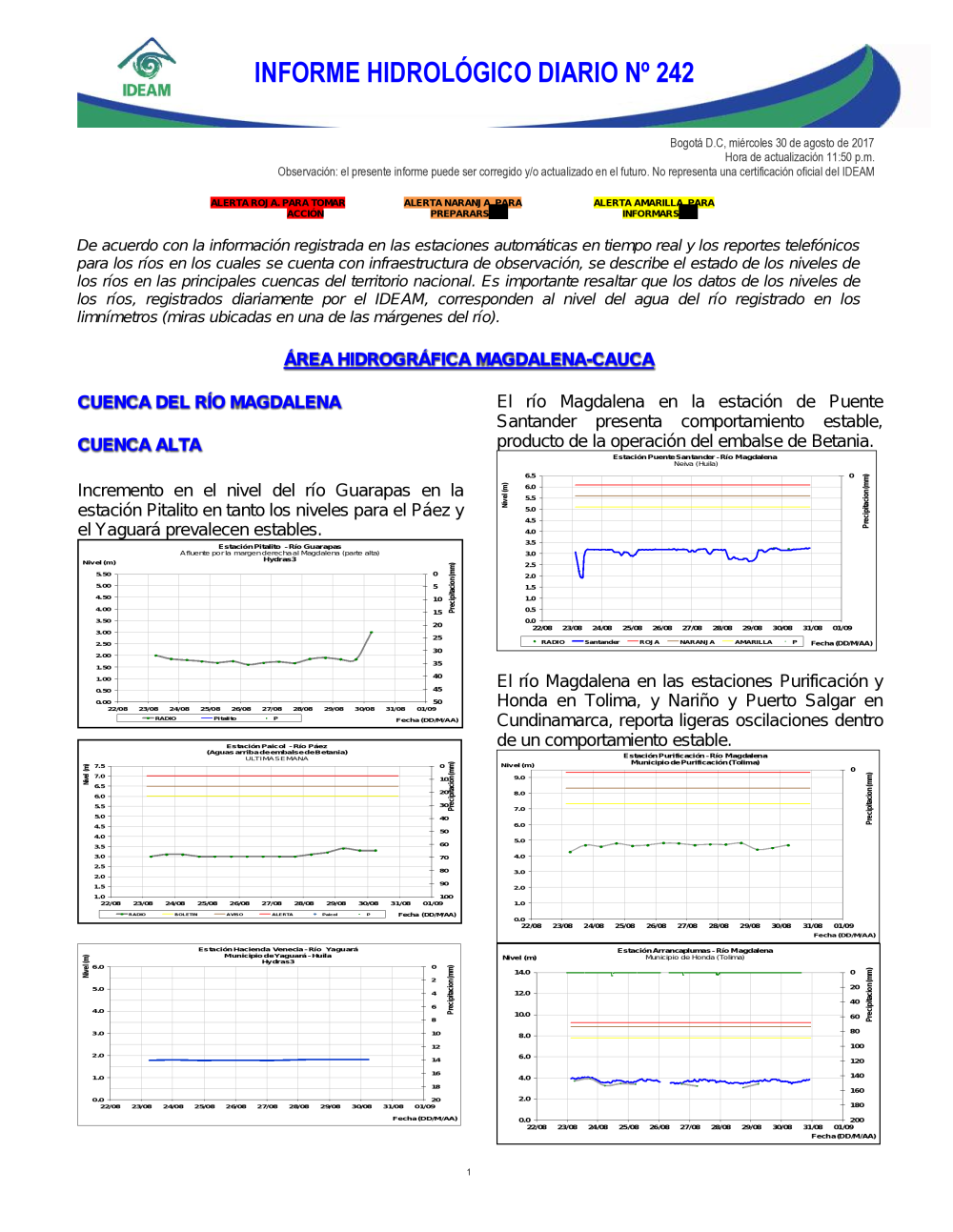En general, el seguimiento que hace el Ideam del comportamiento hidrológico en los principales ríos del país se realiza con la información horaria en tiempo real que se recibe de las estaciones automáticas, complementadas con más de 40 estaciones hidrológicas que transmiten en las primeras horas cada mañana, los 365 días del año.