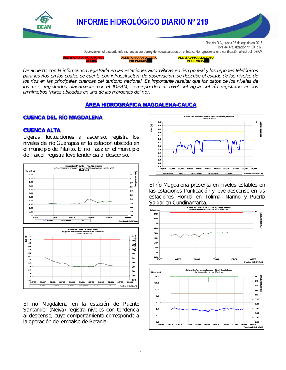 En general, el seguimiento que hace el Ideam del comportamiento hidrológico en los principales ríos del país se realiza con la información horaria en tiempo real que se recibe de las estaciones automáticas, complementadas con más de 40 estaciones hidrológicas que transmiten en las primeras horas cada mañana, los 365 días del año.