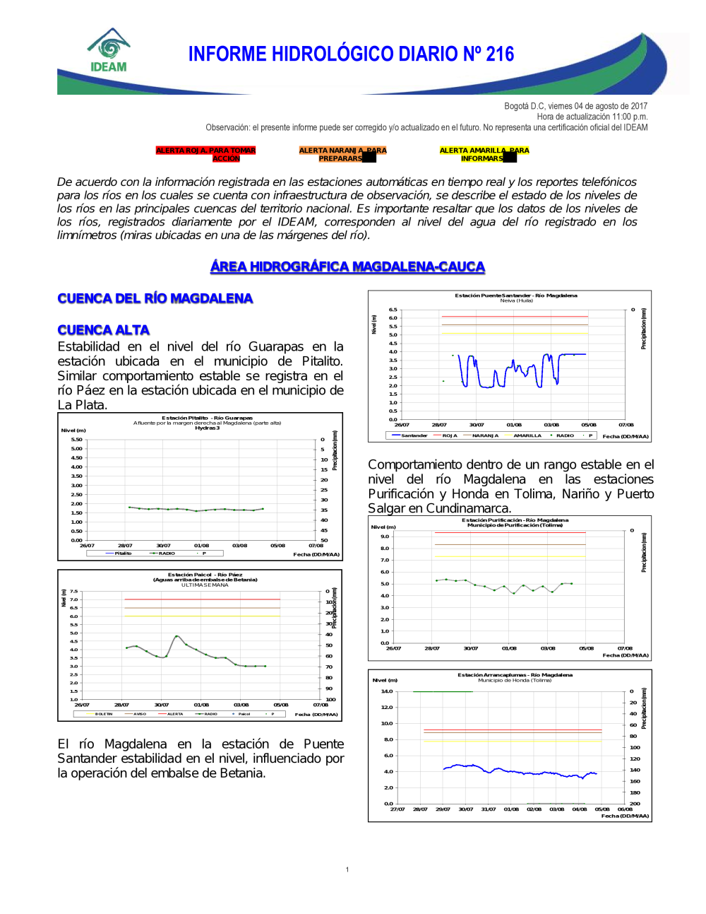 En general, el seguimiento que hace el Ideam del comportamiento hidrológico en los principales ríos del país se realiza con la información horaria en tiempo real que se recibe de las estaciones automáticas, complementadas con más de 40 estaciones hidrológicas que transmiten en las primeras horas cada mañana, los 365 días del año.