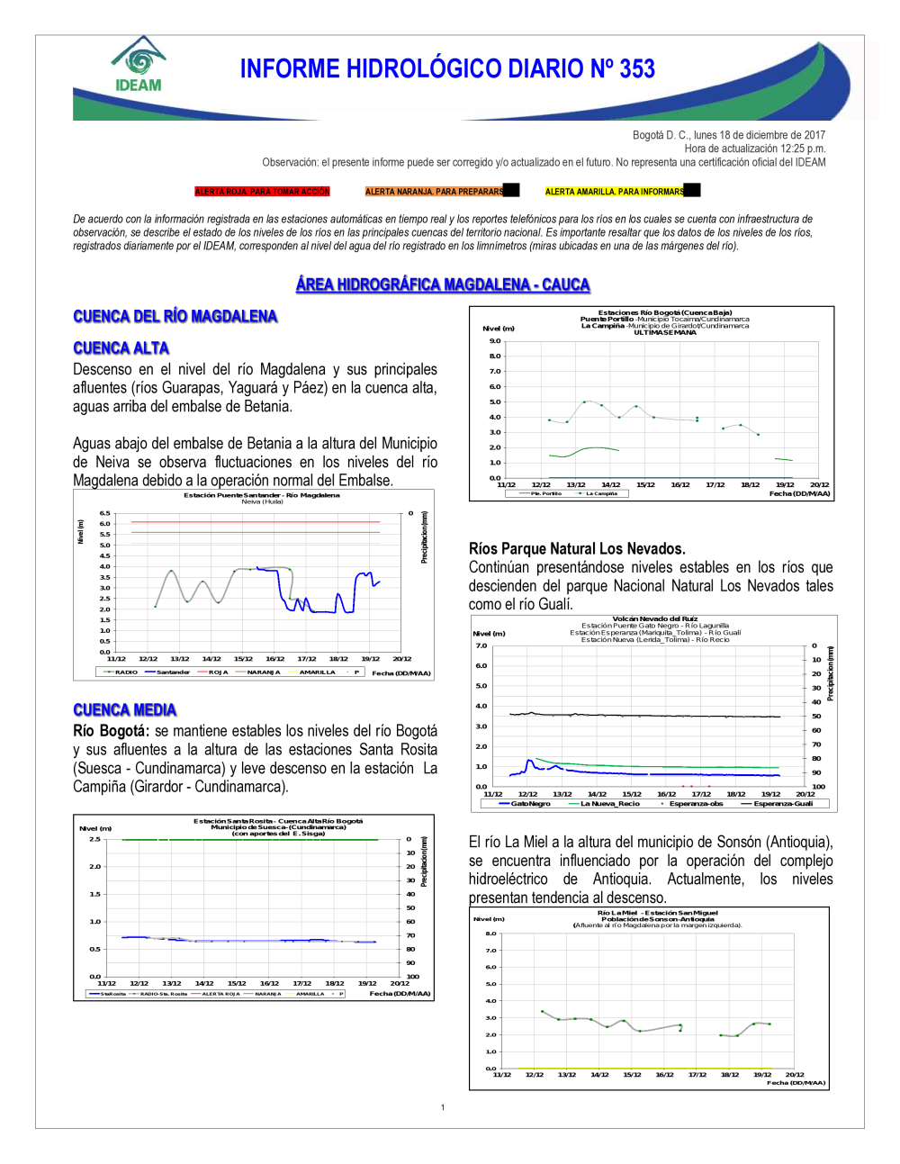 En general, el seguimiento que hace el Ideam del comportamiento hidrológico en los principales ríos del país se realiza con la información horaria en tiempo real que se recibe de las estaciones automáticas, complementadas con más de 40 estaciones hidrológicas que transmiten en las primeras horas cada mañana, los 365 días del año.
