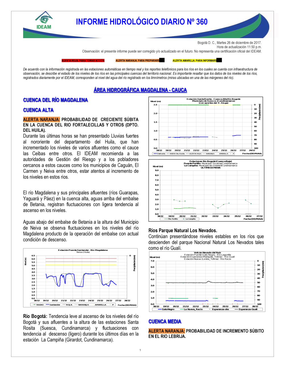 En general, el seguimiento que hace el Ideam del comportamiento hidrológico en los principales ríos del país se realiza con la información horaria en tiempo real que se recibe de las estaciones automáticas, complementadas con más de 40 estaciones hidrológicas que transmiten en las primeras horas cada mañana, los 365 días del año.