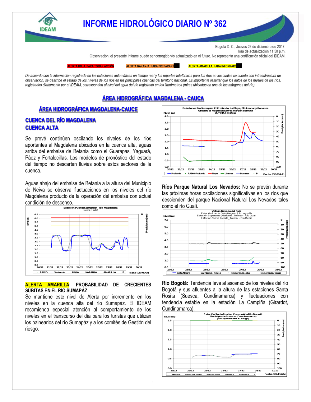 En general, el seguimiento que hace el Ideam del comportamiento hidrológico en los principales ríos del país se realiza con la información horaria en tiempo real que se recibe de las estaciones automáticas, complementadas con más de 40 estaciones hidrológicas que transmiten en las primeras horas cada mañana, los 365 días del año.